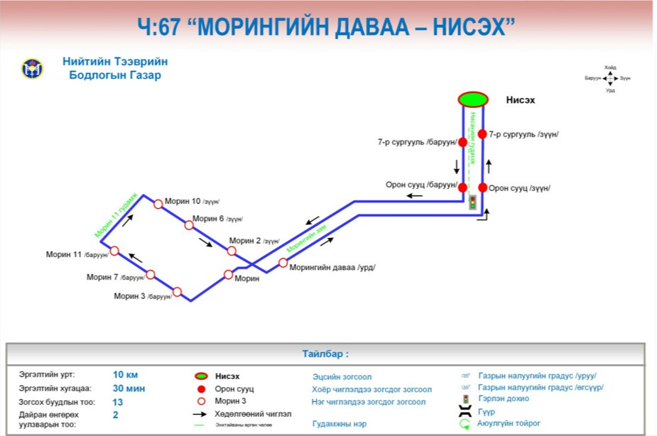 Нийтийн тээврийн үйлчилгээний хүртээмжийг нэмэгдүүлэх, автобусны зогсоол хоорондын зайг ойртуулж, иргэдийн эрэлт хэрэгцээг хангах үүднээс Хан-Уул дүүргийн 10 дугаар хорооны нутаг дэвсгэрт байршилтай Морин зогсоолыг шинээр нээлээ. Тус зогсоолд Ч:67 “Морингийн даваа – Нисэх” чиглэлийн нийтийн тээврийн автобус зогсох юм. Дээрх замналын өөрчлөлтийг энэ сарын 11-ний өдрөөс мөрдөж эхэлнэ.