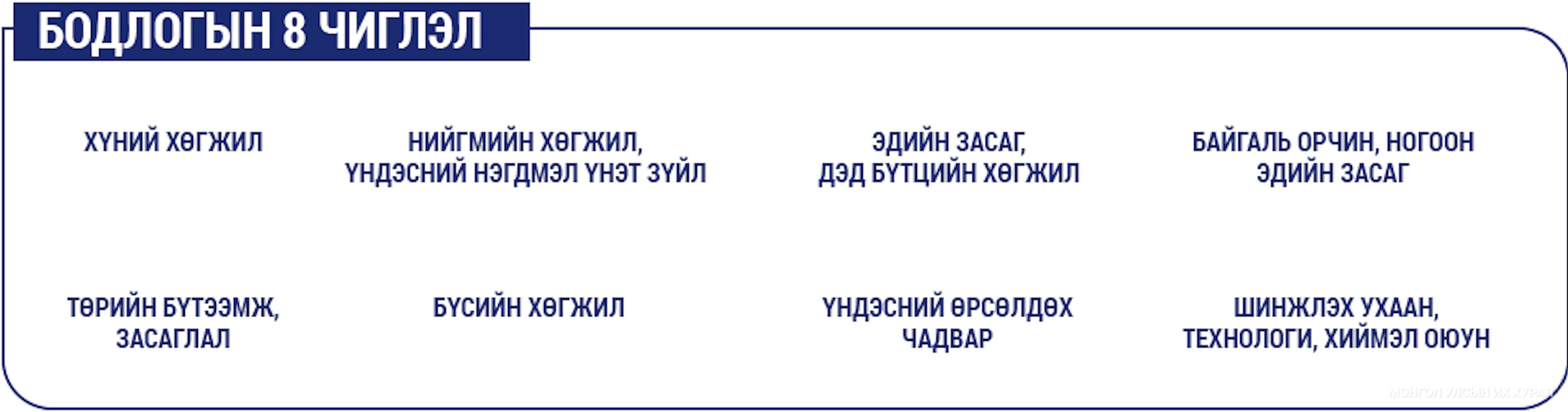 Таван жилийн үндсэн чиглэлд бодлогын найман чиглэлийн тогтоож, үр дүн, түүнд хүрэх арга замуудыг үндэсний болон салбарын хэмжээнд, мөн төсвийн ерөнхийлөн захирагчийн чиг үүргийн хүрээнд, төсөл хөтөлбөр тус бүрийн тухайд нэг бүрчлэн тодорхойлсон байна.