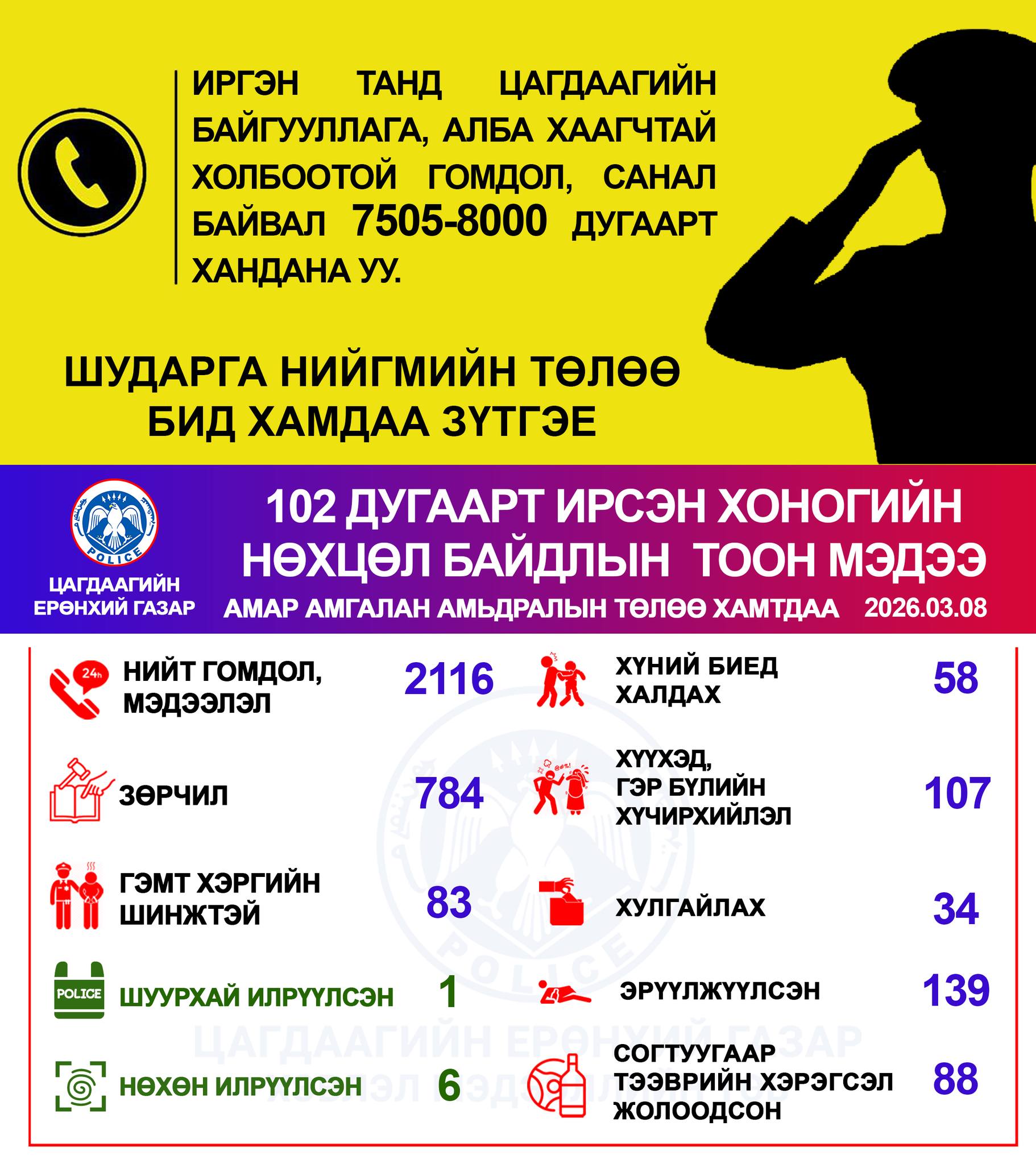 Цагдаагийн байгууллагын 102 тусгай дугаарт энэ оны 03 дугаар сарын 08-ны өдөр нийт 2116 дуудлага, мэдээлэл бүртгэгдсэнээс зөрчлийн шинжтэй 784, гэмт хэргийн шинжтэй 83 дуудлага, мэдээлэл байна.
