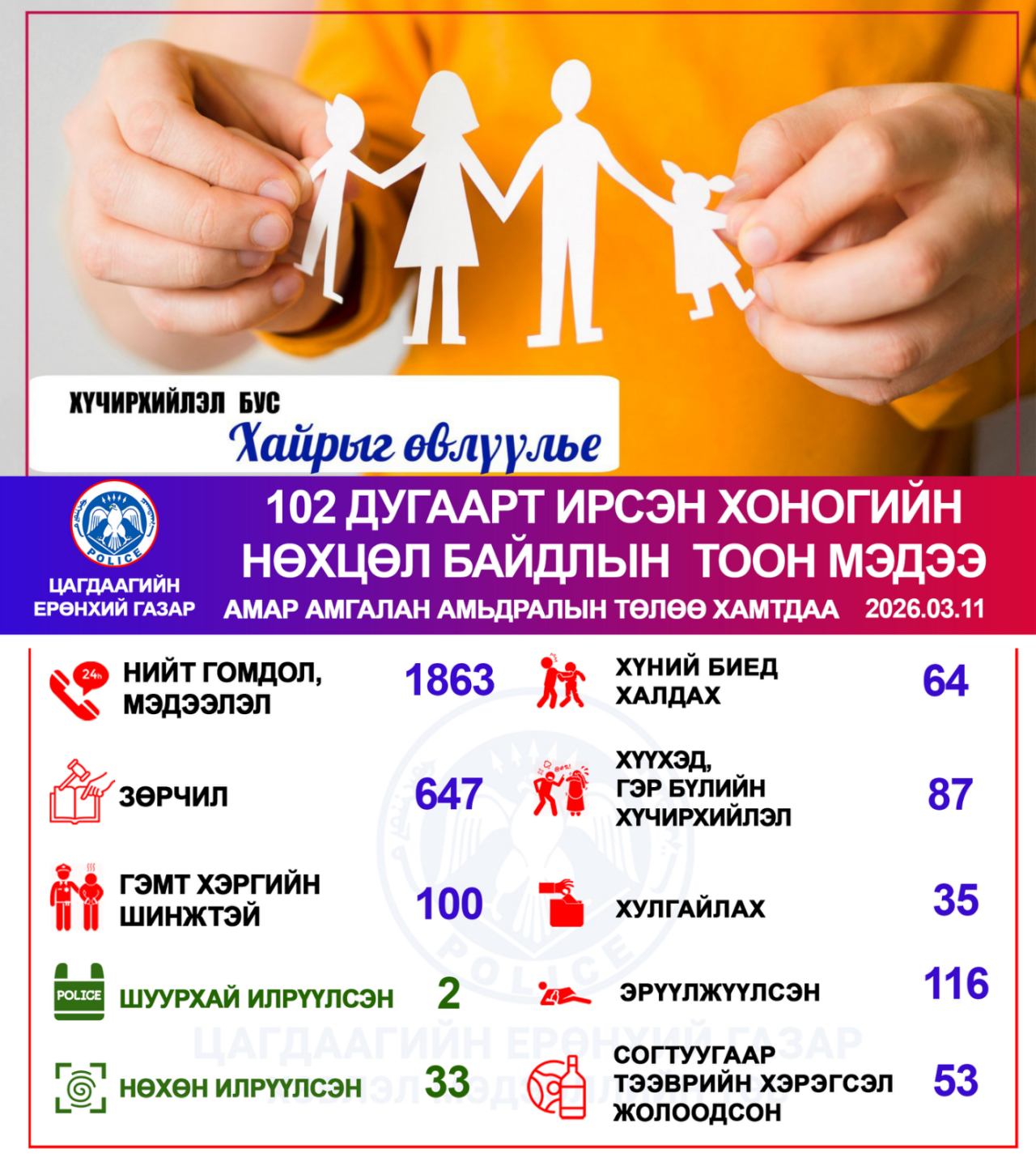 Цагдаагийн байгууллагын 102 тусгай дугаарт 2026 оны 03 дугаар сарын 11-ний өдөр нийт 1863 дуудлага, мэдээлэл бүртгэгдсэнээс зөрчлийн шинжтэй 647, гэмт хэргийн шинжтэй 100 дуудлага, мэдээлэл байна.