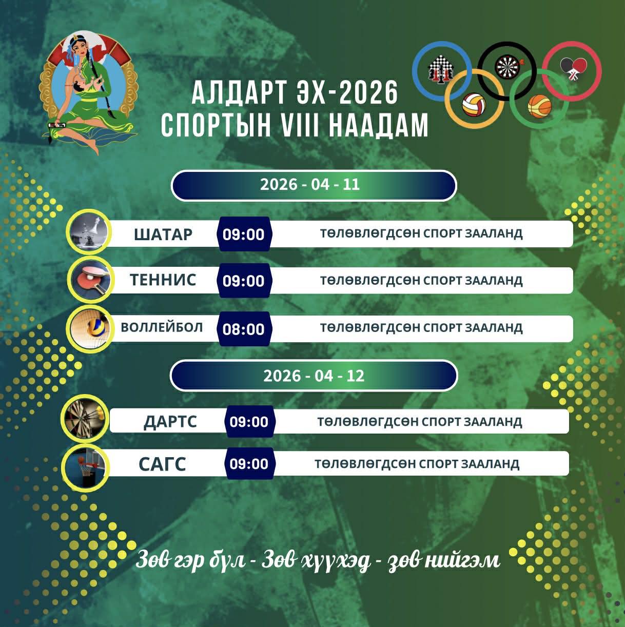 “Зөв гэр бүл-Зөв хүүхэд-Зөв нийгэм” уриан дор эмэгтэйчүүдийн эрүүл амьдралын хэв маягийг дэмжих, идэвхтэй хөдөлгөөн, спортыг хөгжүүлэх, Олимпизмыг түгээн дэлгэрүүлэх зорилготой “Алдарт Эх-2026” спортын VIII наадам дөрөвдүгээр сарын 11-12-ны өдрүүдэд Улаанбаатар хотноо зохион байгуулагдана.